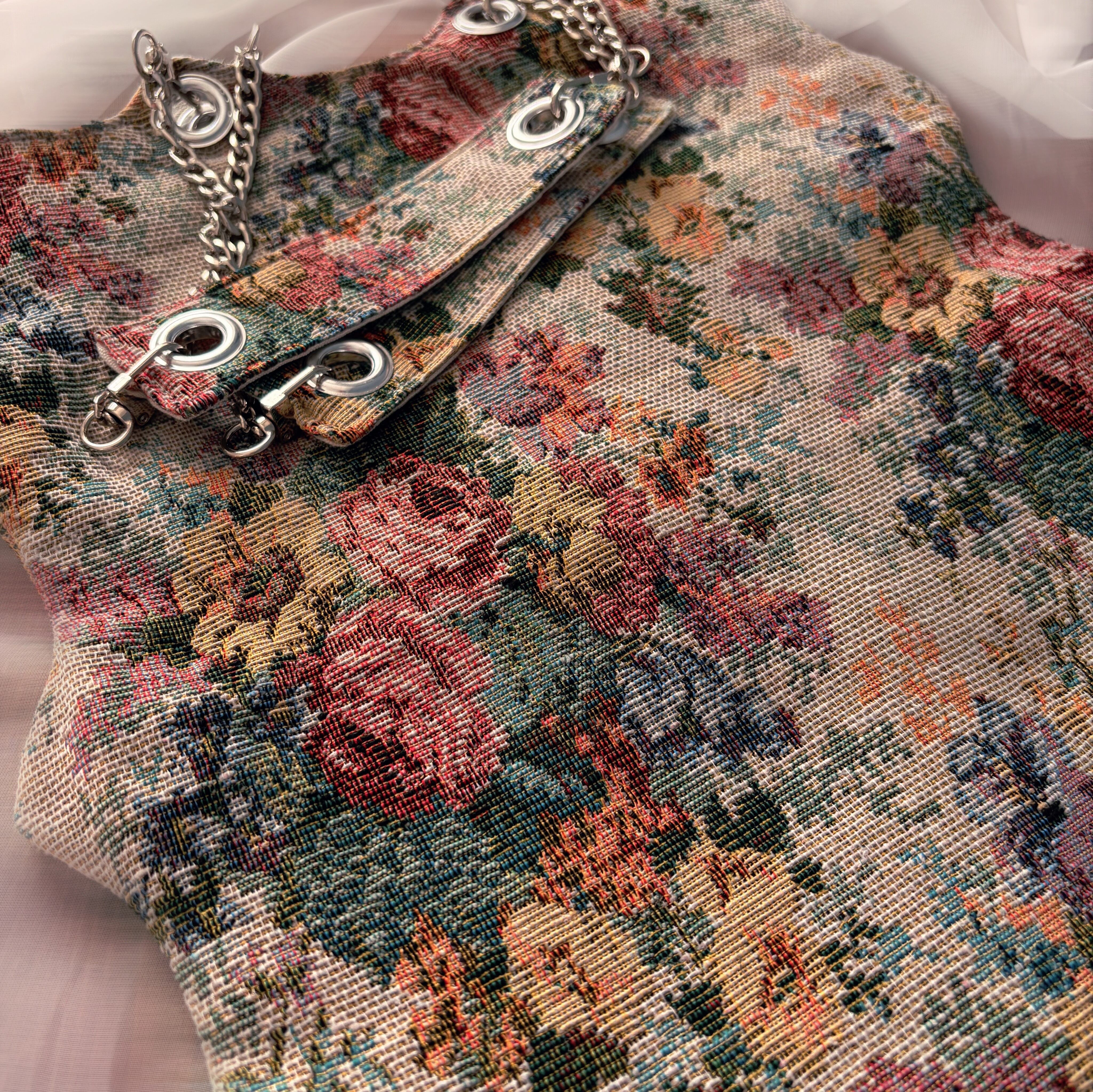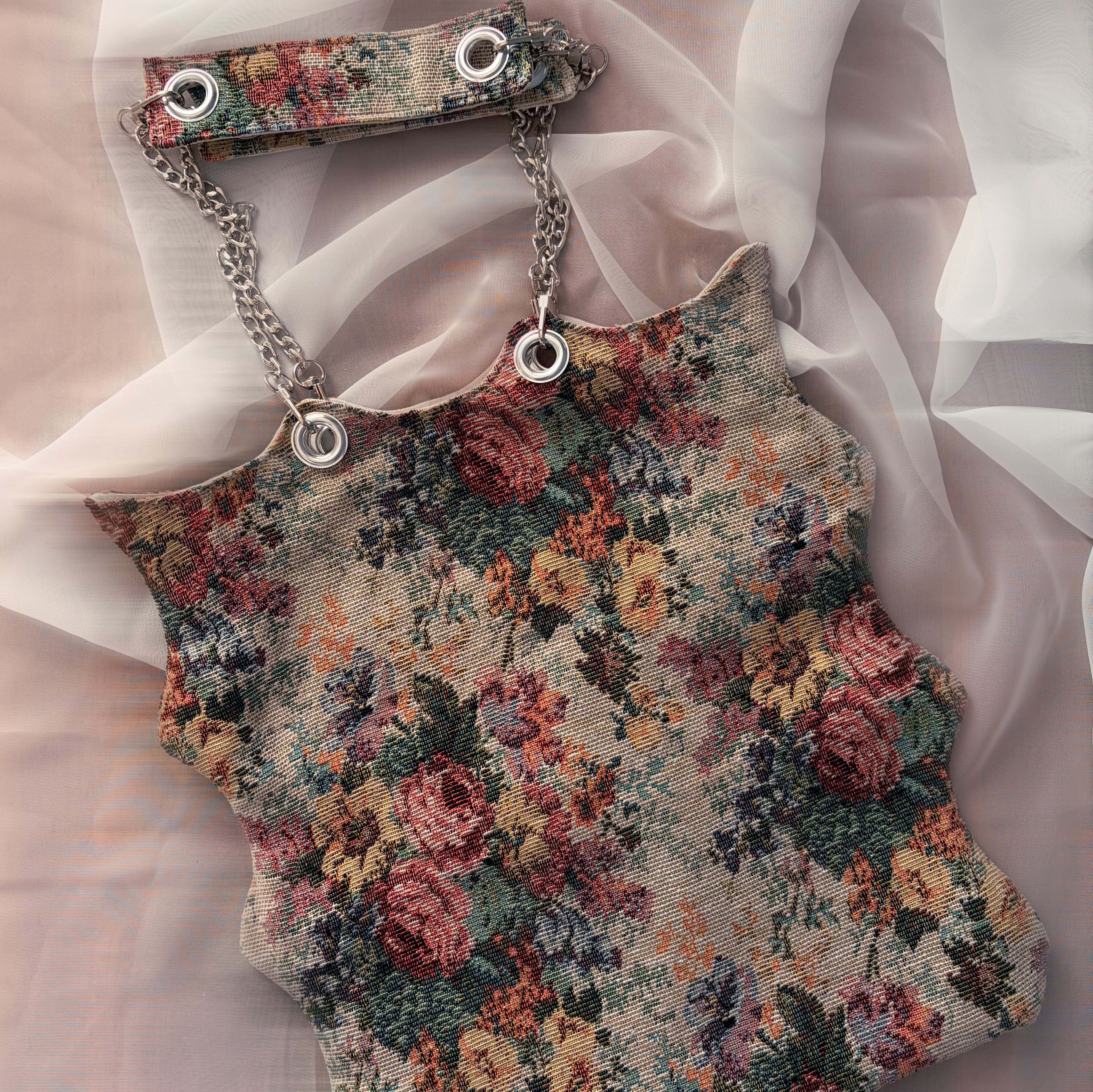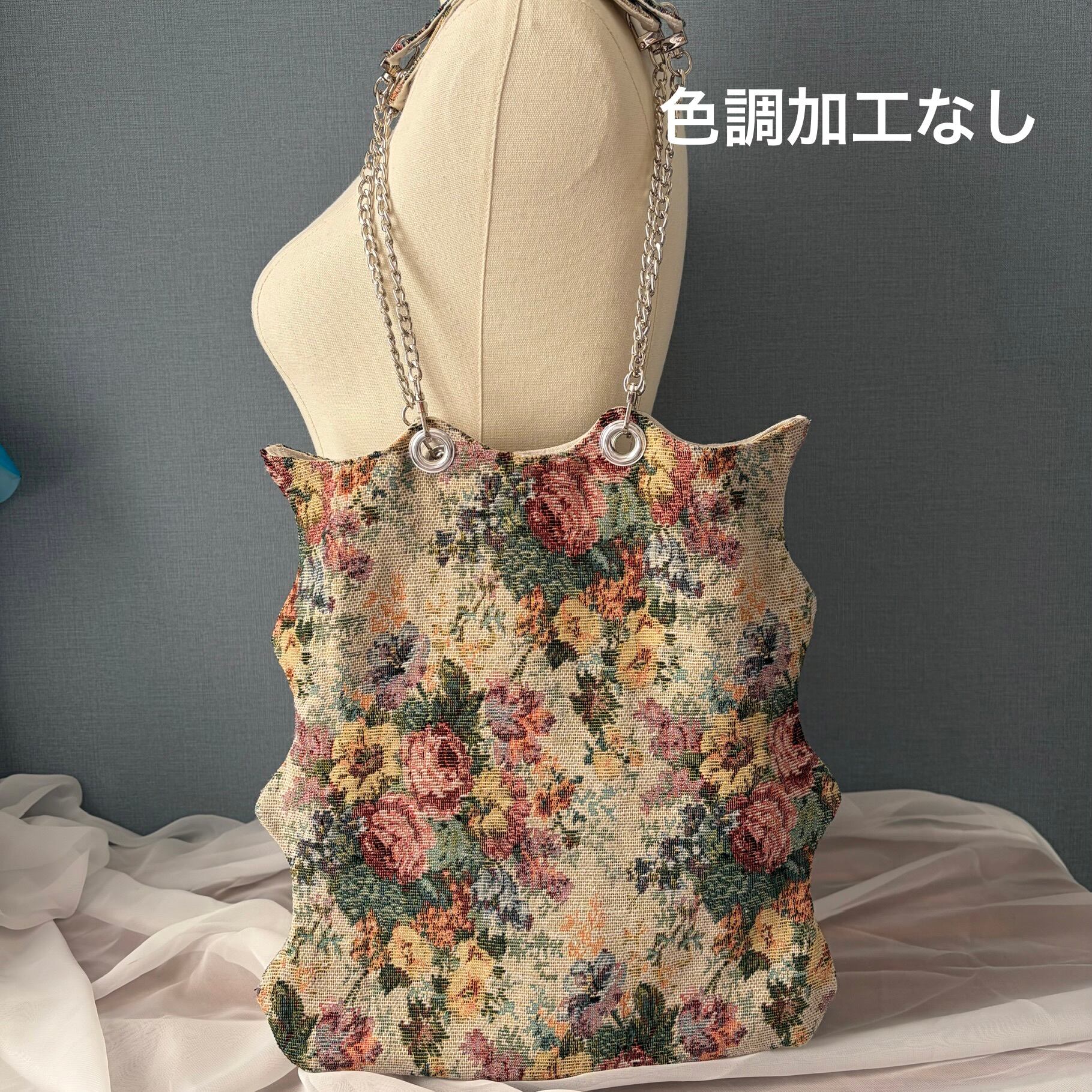 コーデに1枚加えるだけで、その日の主役になれるバッグを作りたくて生まれました。ゴブラン生地にレトロな花柄となみなみシルエットの組み合わせは、他ではなかなか出会えないデザインです。